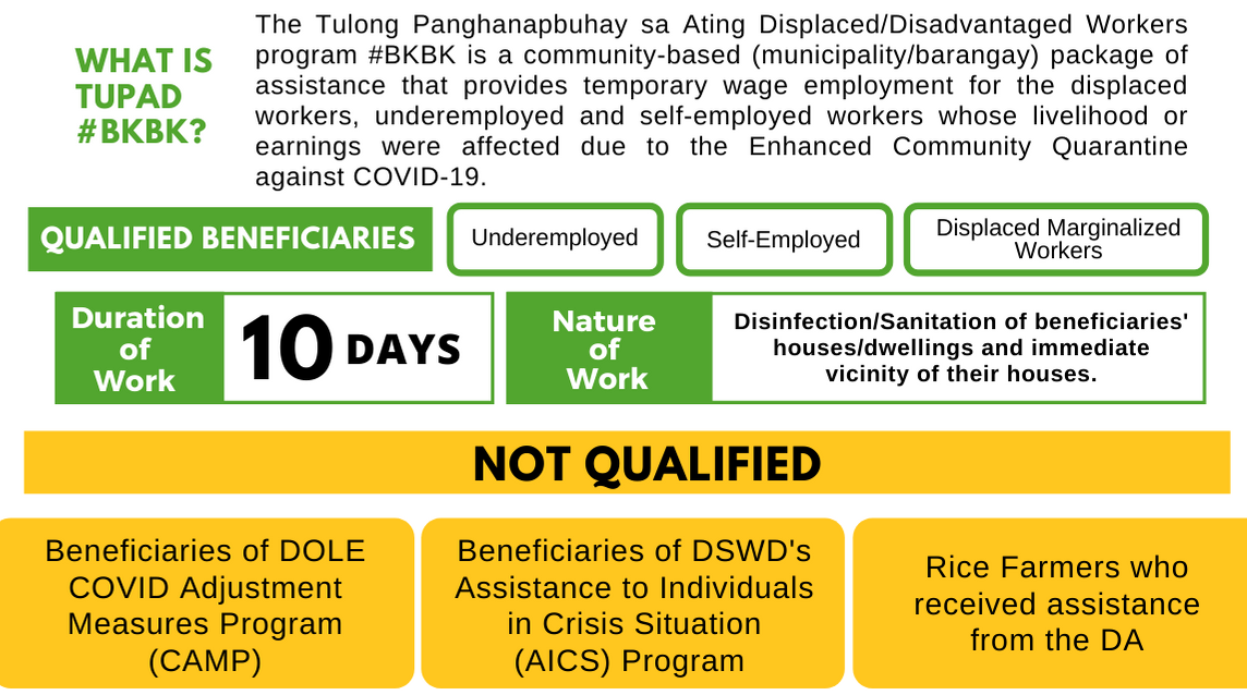 - Department Order No. 210, s. 2020: Guidelines for the Implementation of the Tulong Panghanapbuhay sa Ating Displaced/Disadvantaged Workers Program (TUPAD) #BARANGAY KO, BAHAY KO (TUPAD #BKBK) Disinfecting/Sanitation Project